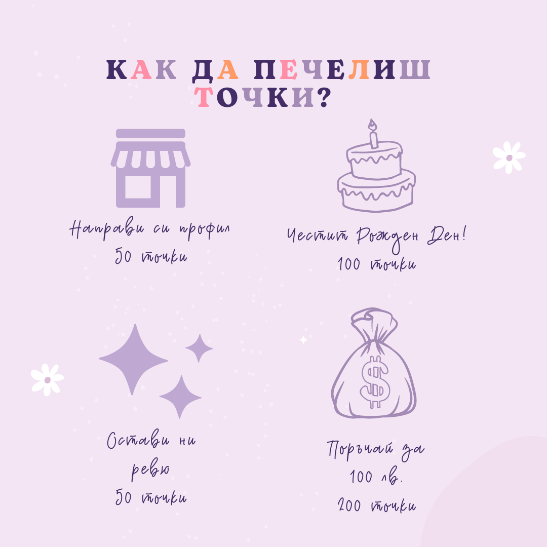 По-горе можеш да откриеш различните активности, както и в секцията "Награди". Точки ти носят ревютата, които оставяш за продуктите ни, сума на направени поръчки и тн.