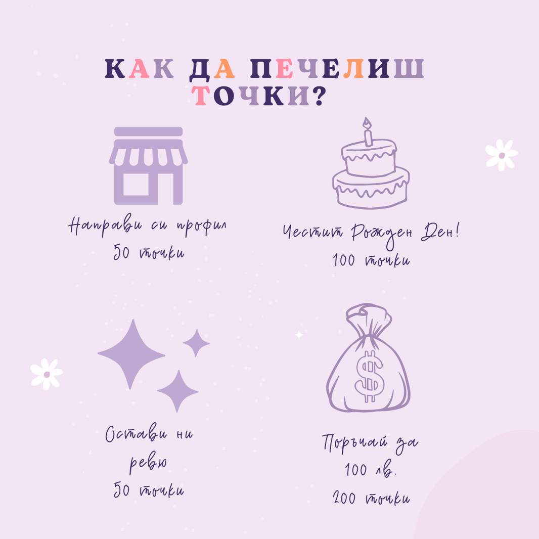 Печелете точки за всяко действие на сайта ни, след което можете да превърнете тези точки в отстъпка от бъдещи поръчки, да ги трупате или да ги използвате.