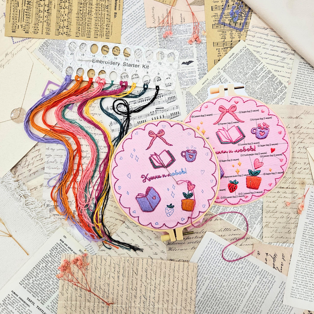 Комплект за бродерия с всичко необходимо, за да създадеш нещо красиво със собствените си ръце – конци, игли, плат за бродиране, инструкции и обръч за бродерия.