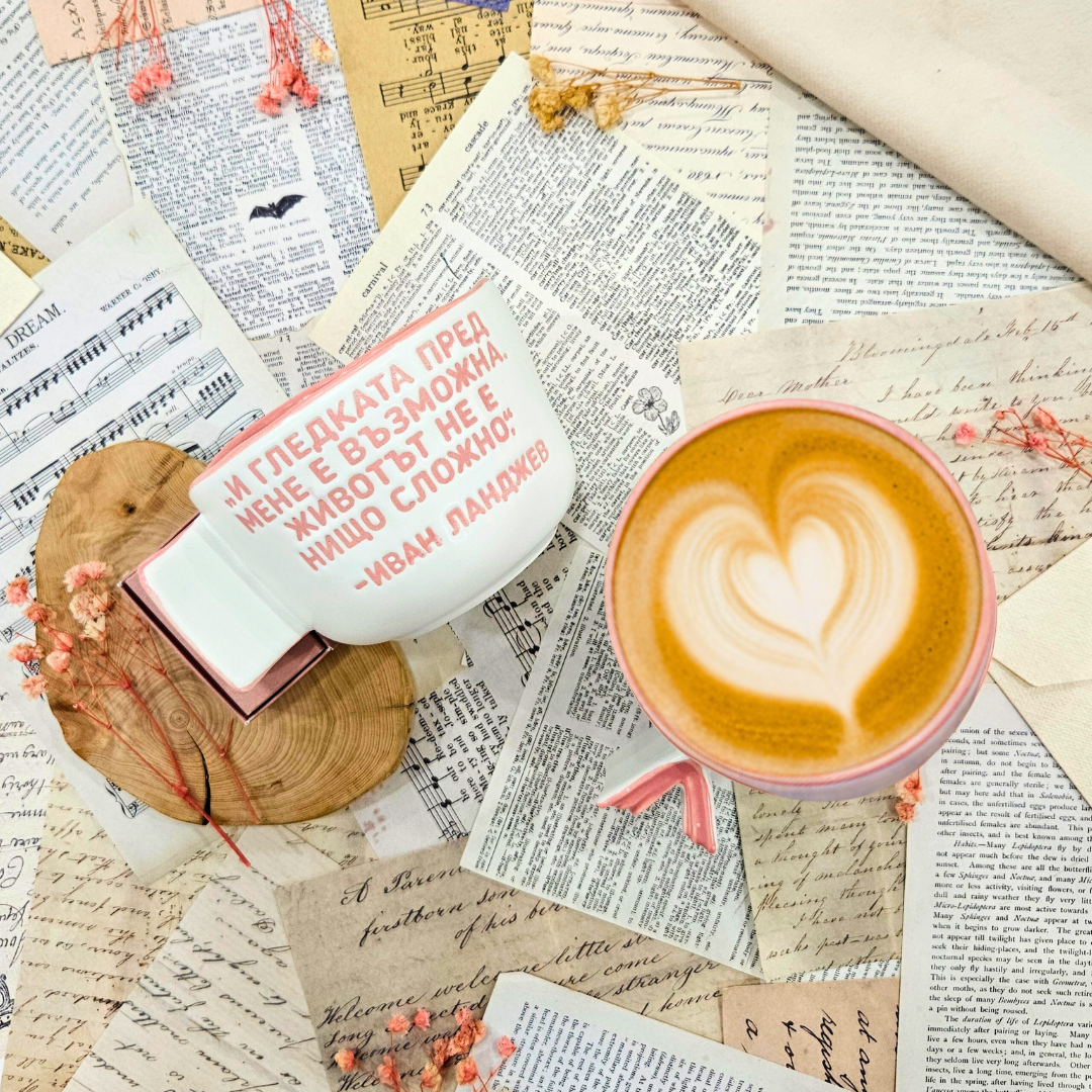 Керамична чаша с цитат и дръжка във формата на книга: „И гледката пред мене е възможна, животът не е нищо сложно.“ - Иван Ланджев